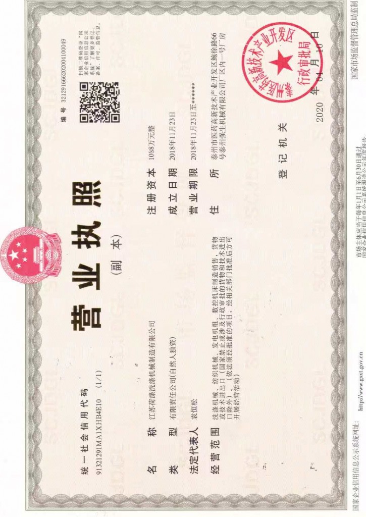 地 址:泰州市医药高新技术产业开发区鲍徐路66号泰州强生机械有限公司厂区内一号厂房