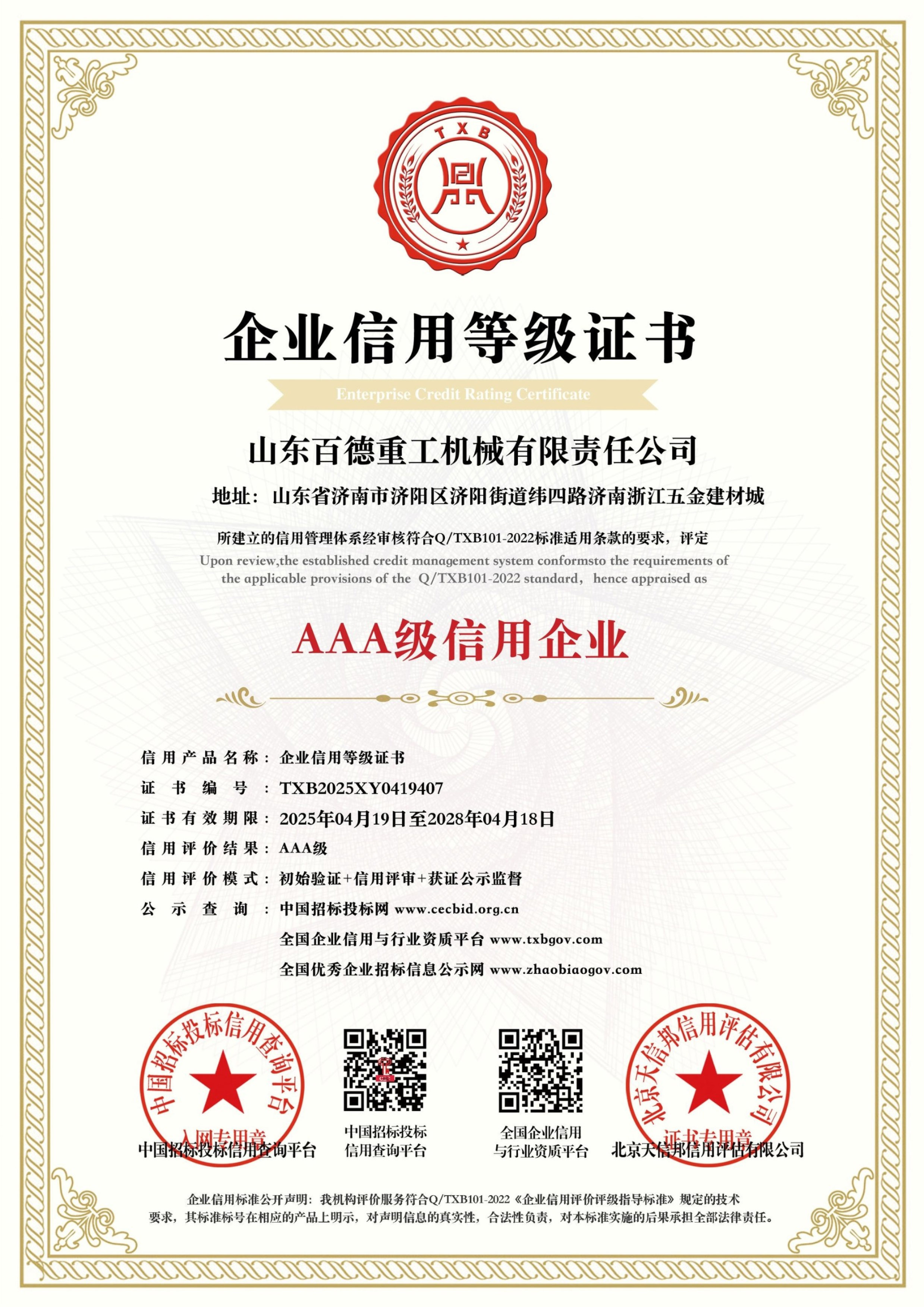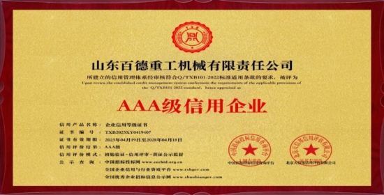 恭喜山东百德重工机械有限责任公司荣获“AAA级信用企业”!! 恭喜山东百德重工机械有限责任公...