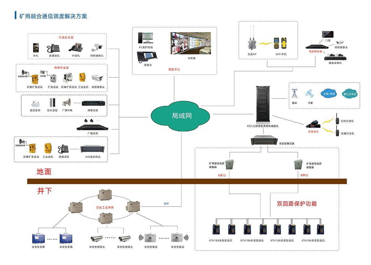 矿用本安型程控调度机和触摸屏调度台,具有丰富的融合调度功能,支持行政调度一体化、可实现一键调度、直通电话、群呼、群答、组呼、全呼、多方通话、强插、强拆、监听、录音等功能,还可实现与瓦斯报警、视频监控、人员定位等系统的互联互通,联动协同,提高生产管理效率。