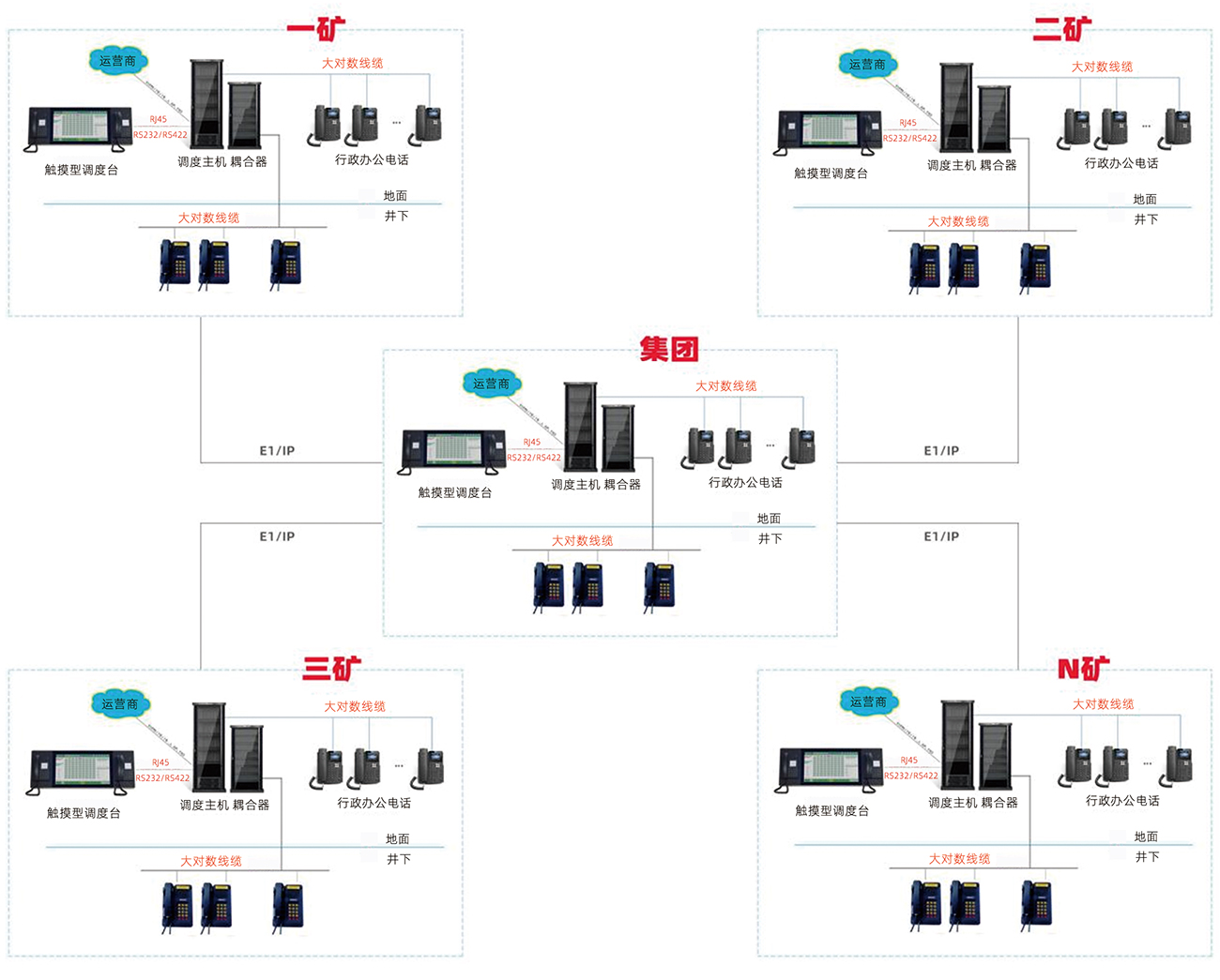 多数矿业集团公司以多矿点、矿距远等因素。因此,要求煤炭专网调度通信应充分运用一体化网络理念,采用一体化网络通信平台。除必须建立行政通信系统,设立总调度指挥中心外,还必须建立一、二矿生产调度通信系统,分别配置数字程控调度机,可由总调度指挥中心,统一调度管理下属矿调度指挥中心,实现总调人员通过调度台能随时与任何一个通信系统内的任何一部电话建立联系,达到迅捷方便,一键到位的要求。可以随时与上级调度建立联系,并相互成网,各矿区电话实现等位互拨,以满足现代化先进的采煤生产调度指挥需要。